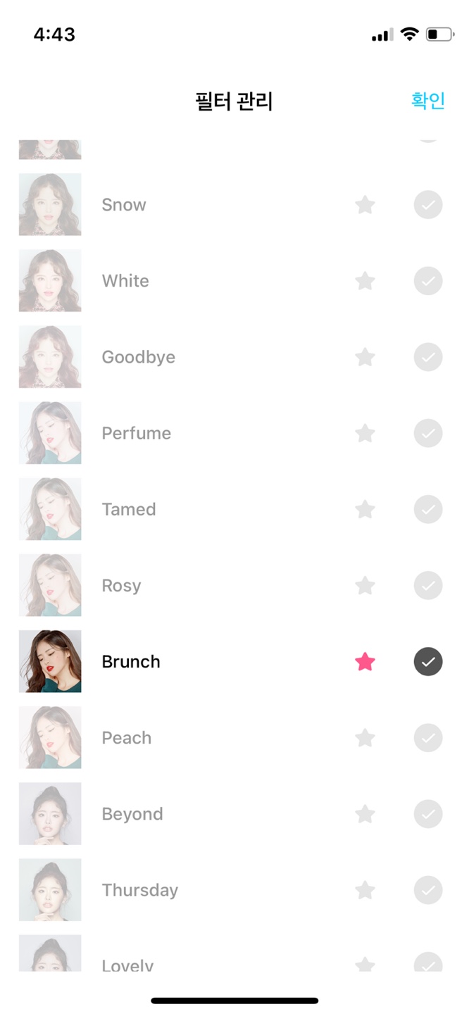 스노우 어플실행-필터-톱니바퀴(설정)-원하는 필터 활성화 후 확인