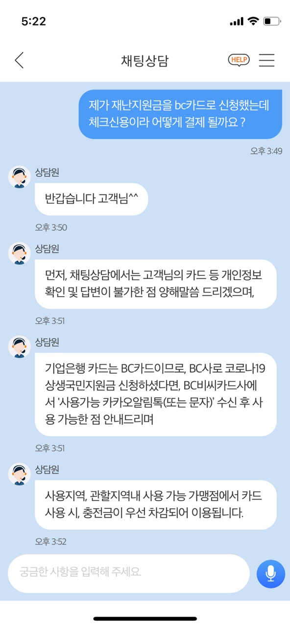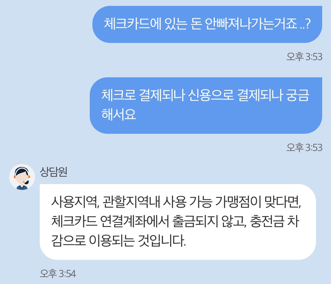 체크카드에도 한달 생활비가 있고 신용카드로도 결제될 수 있는 카드라 혹시 내 돈이 결제되지 않을까 걱정에 미리 여쭤봄... 오랜만에 의심병자모드... 친절하게 상담해주신 삼당원님 감사합니다.