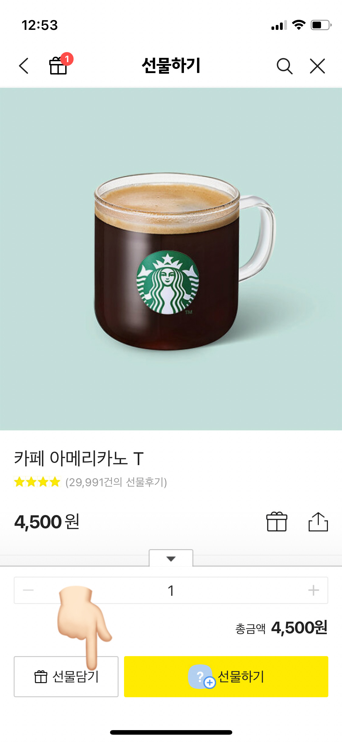 1. 원하는 상품을 선택하여 '선물상자'를 누르고 '선물담기'를 눌러준다.