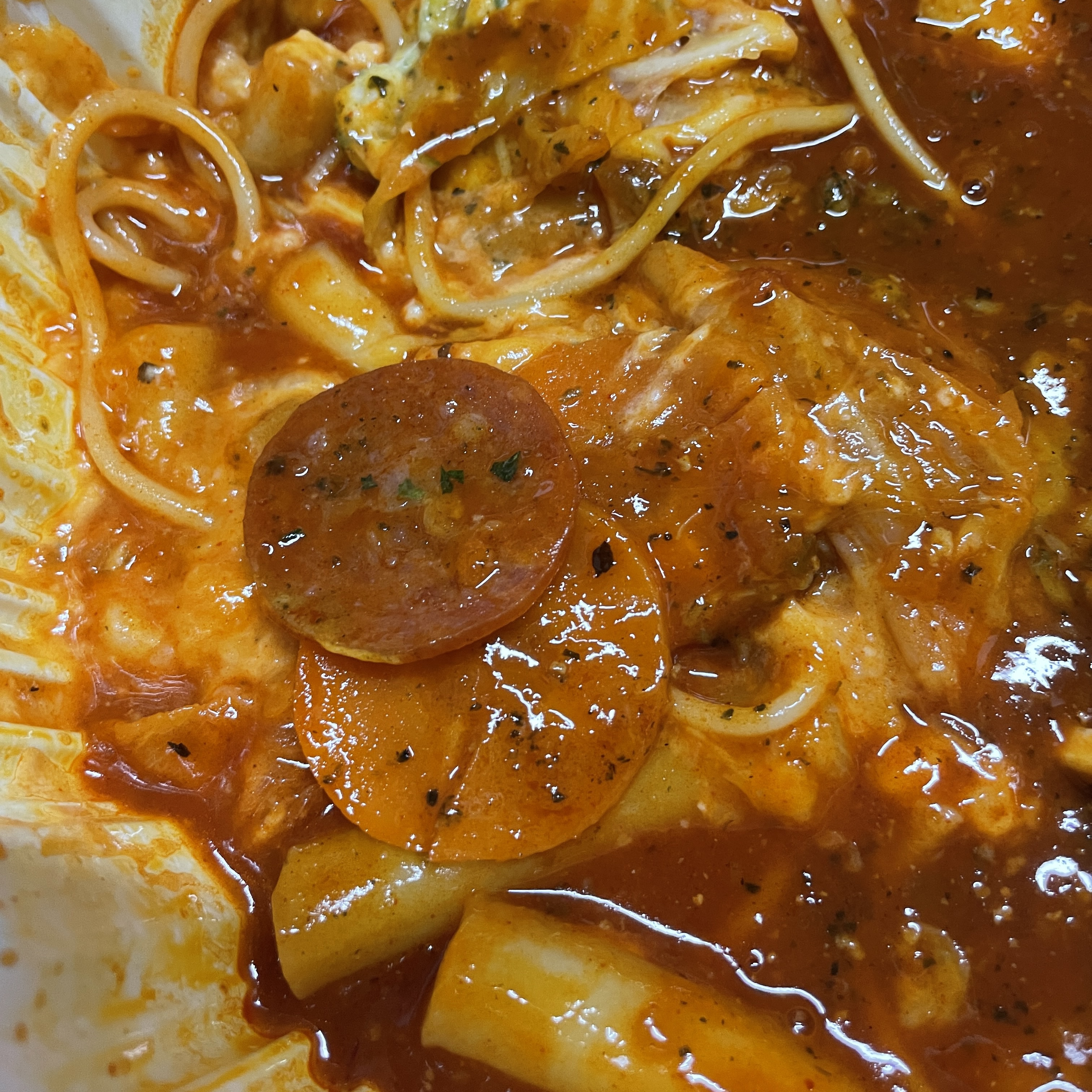 피자로니 떡볶이에는 아라비아따토마토스파게티맛? 베이스 소스에 떡볶이 6줄, 어묵 6개 스파게티면이 넉넉하게 들어있다. 그 위로는 모짜렐라 치즈가 잔뜩... 그 위에 절반 이상이 페퍼로니 햄이 잔뜩 ~ 그리고 나머지 부분에는 감자샐러드가 4스쿱 정도 올라가 있고 그 위에는 슈레드 치즈와 파슬리가 솔솔 ~