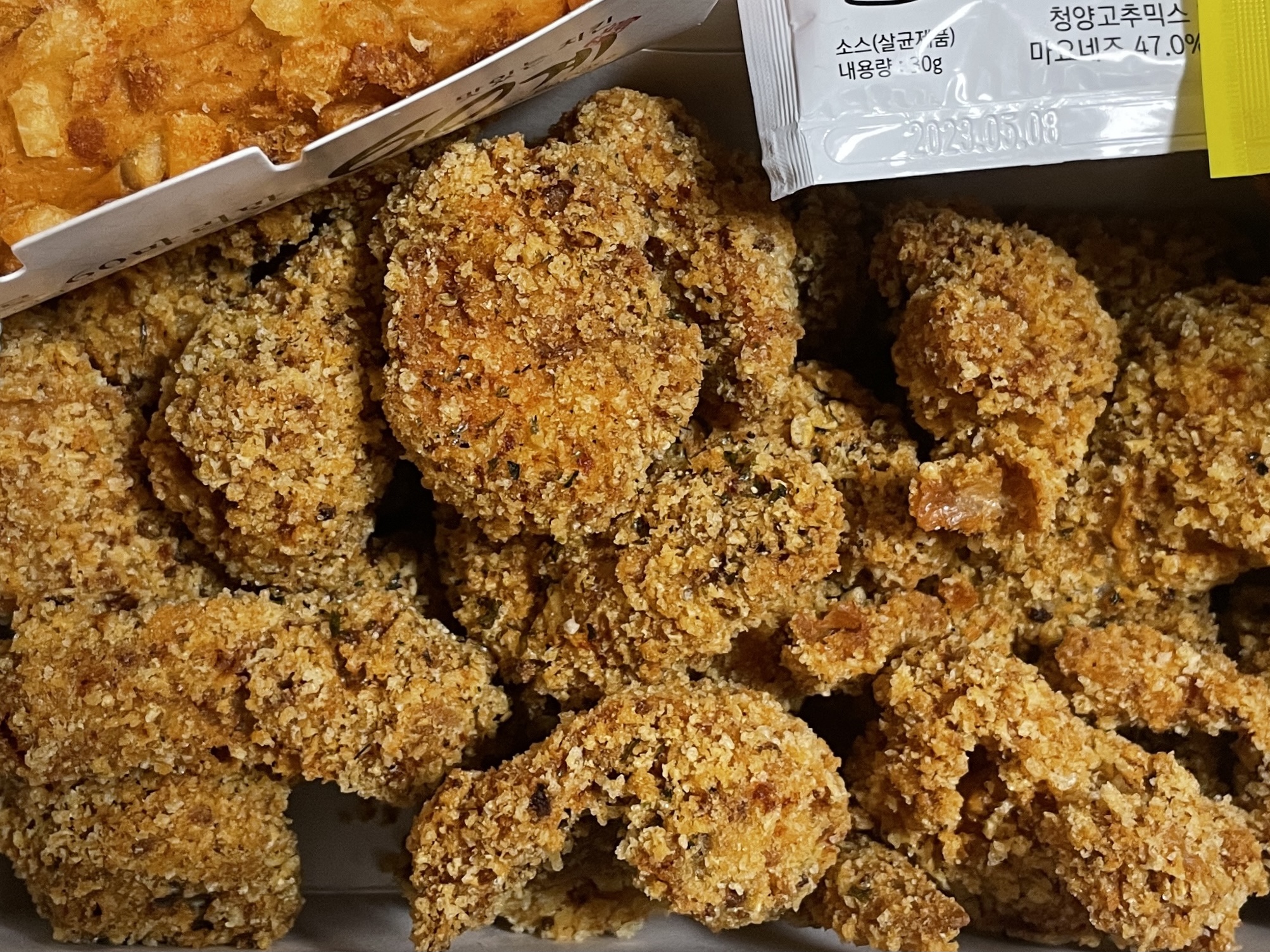 진짜 바삭을 넘어 빠작빠작한 치킨인데 뭔가 너무 기름지지 않고 고소하달까? 이 겉 튀김옷이 무언가 궁금한데 나는 빵가루? 느낌을 받았다 정말 빠작빠작할 정도로 튀겨졌는데 딱딱하거나 치킨 자체가 건조? 마른 느낌 없이 겉빠속초의 정석이랄까? 후리가케 같은 김가루?가 뿌려져 있는데 맛에 큰 영향은 주지 않았다. 오히려 아주 미미하지만 후추나 허브 향이 아주 조금이지만 났다. 이 치킨의 특징은 맛보다는 식감에 있는 거 같다. 정말 빠작빠작하고 맛있는 후라이드 !