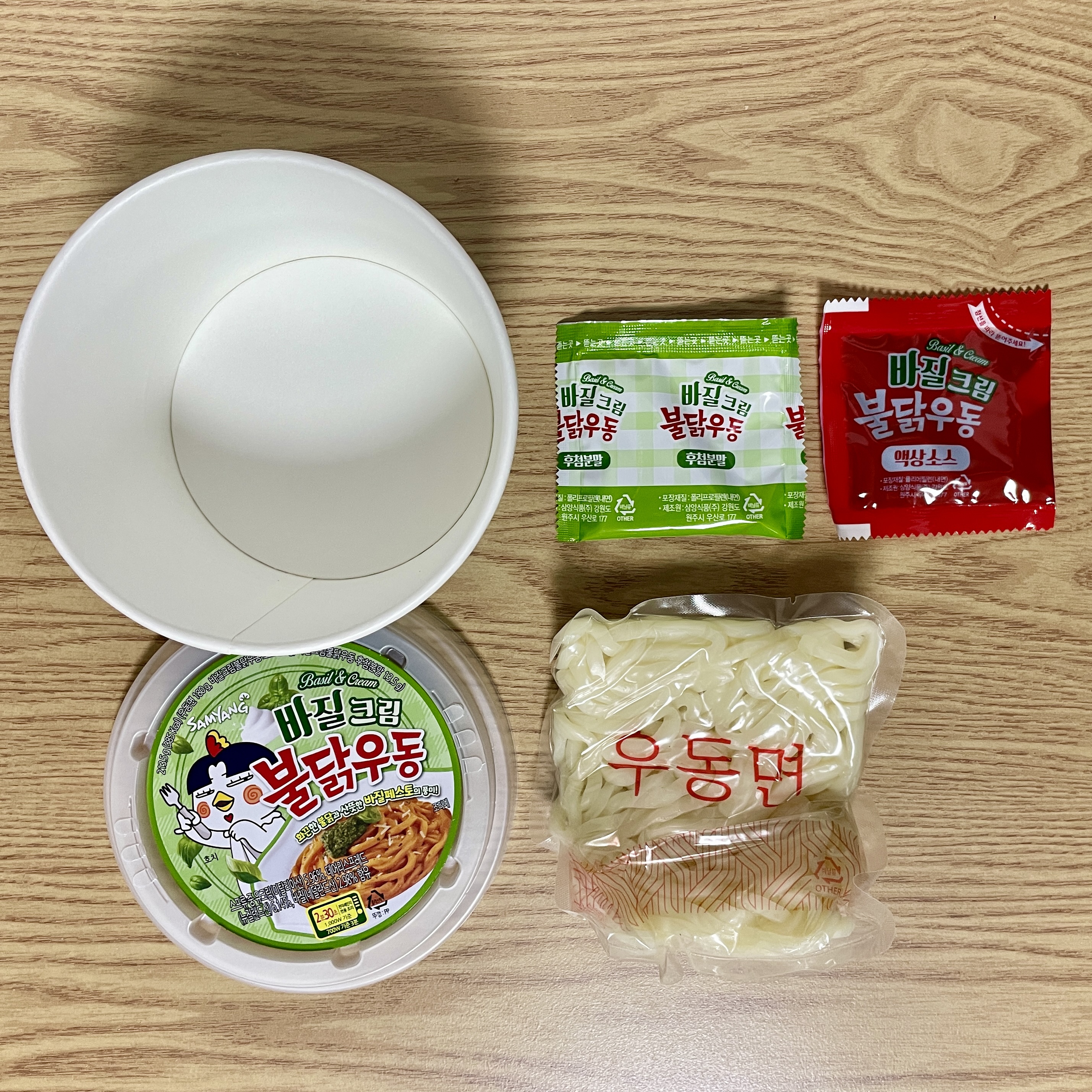 바질크림불닭우동 소스:바질페스토소스, 버터맛소스, 정제수, 삼양간장본, 매운치즈소스, 정백당, 그릴치킨농축액, 치킨향분말,고과당, 하바네로맛시즈닝, 정제염, 맛베이스에스, 매운고추베이스분말, 양파, 혼합전지분유, 고춧가루, 마늘, 지미강화육수분말, 마늘분말, 탈색칠리추출물, 파프리카추출물, 흑후추분말, 치킨카레맛베이스....