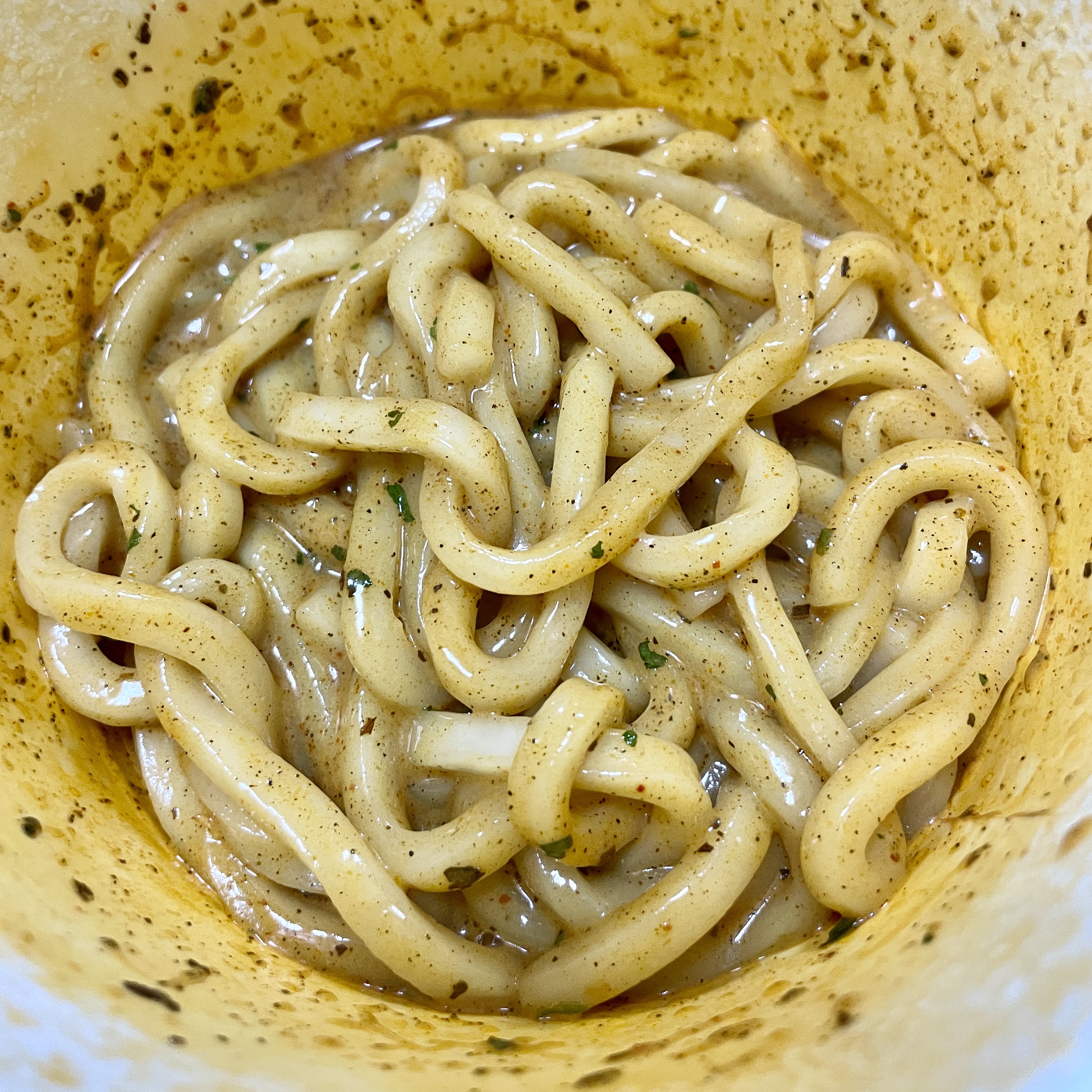 꾸덕꾸덕 매콤향긋?한 바질크림불닭우동 완성...! 첫맛은 불닭? 맛인가 아주 잠깐 생각이 스칠 때 강한 바질맛이 아니야 나야!하고 강하게 내리친다. 바질향이 정말 강한편... 바질 파스타나 떡볶이나 정말 좋아하고 잘 먹는데 먹으면서 이게 크게 호불호가 갈릴까 싶었는데 이녀석은 확실하게 갈릴 거 같다... 바질을 좋아했던 사람도 뒤돌아설 수 있을 정도로 강하다... 아마 이게 특유 강한 맛이 있는 불닭소스와 합쳐져 매움과 향의 시너지가 올랐다고 생각한다. 뭔가 바질을 넘어 마라탕에 들어가는 산초기름이나 쑥?까지도 생각나는 약제에서 날법한 풀맛? 향식료?맛이 난다. 바질을 정말 좋아하거나 내가 말했던 산초, 쑥 등 특유 향을 즐기는 사람이라면 정말 좋아할 거 같다. 면도 되게 쫄깃쫄깃하고 맛 자체는 좋다. 액상소스에 힘을 좀 뺐으면 어땠을까... 약간의 아쉬움이 남는다.