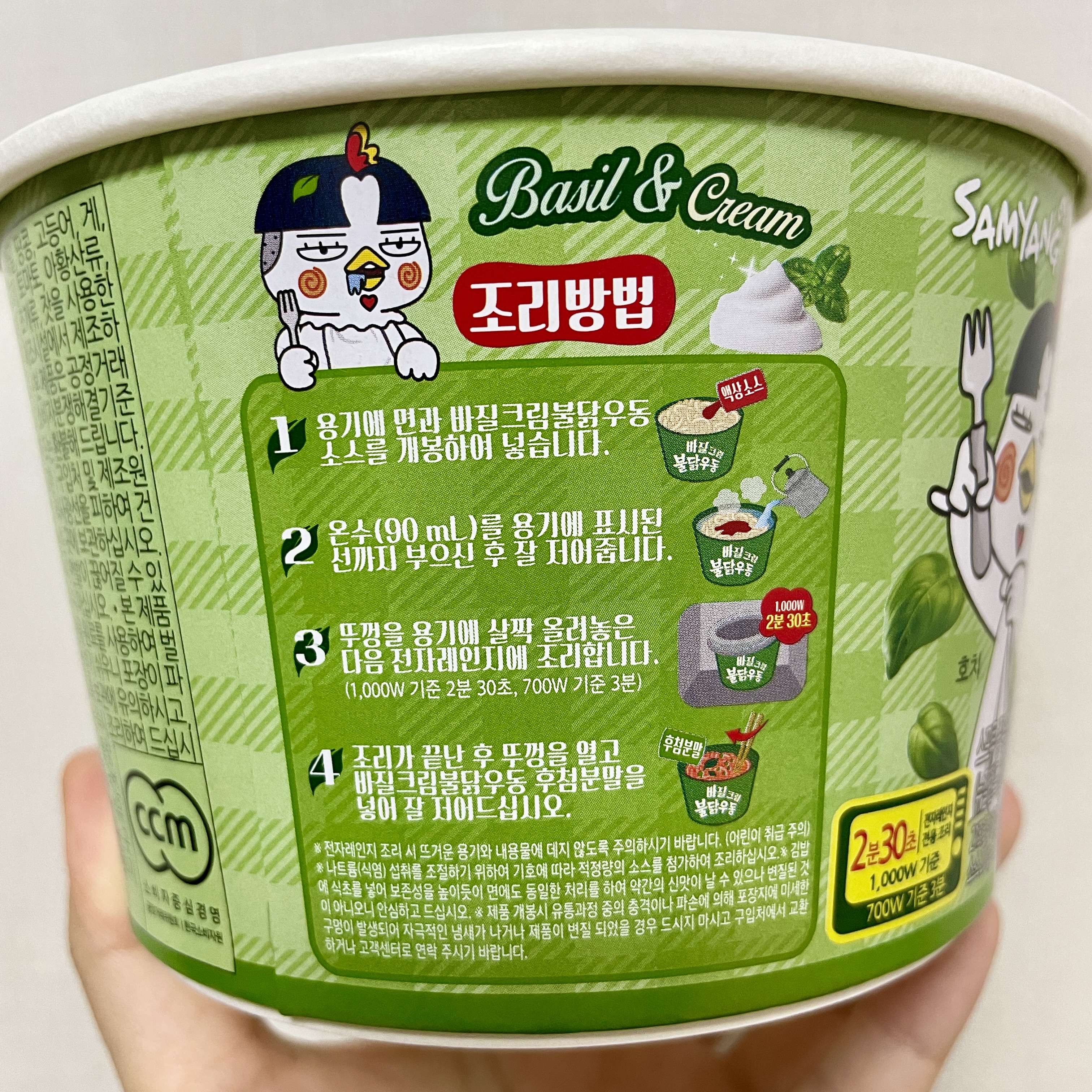 조리방법은 우동면, 액상소스, 물 90ml를 넣고 뚜껑을 살짝 올려 전자레인지에 3분 돌린다. 그리고 뚜껑을 열어 후첨분말을 넣고 섞는다. 끝 ^ㅇ^!